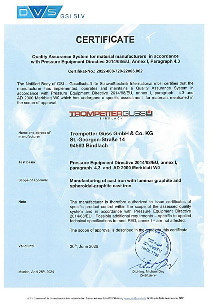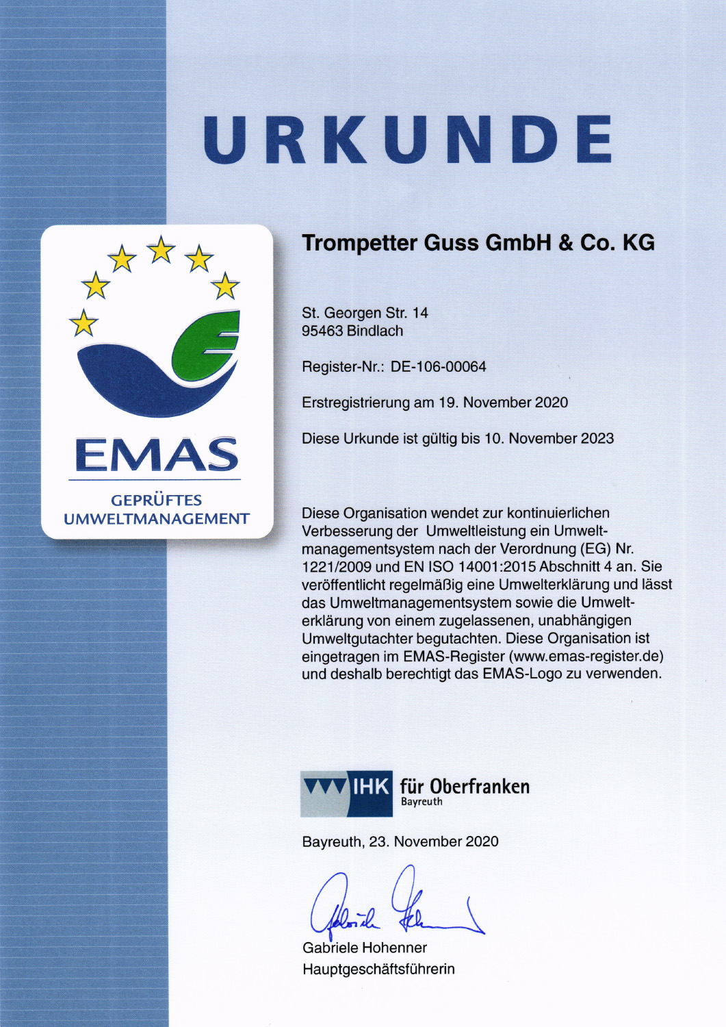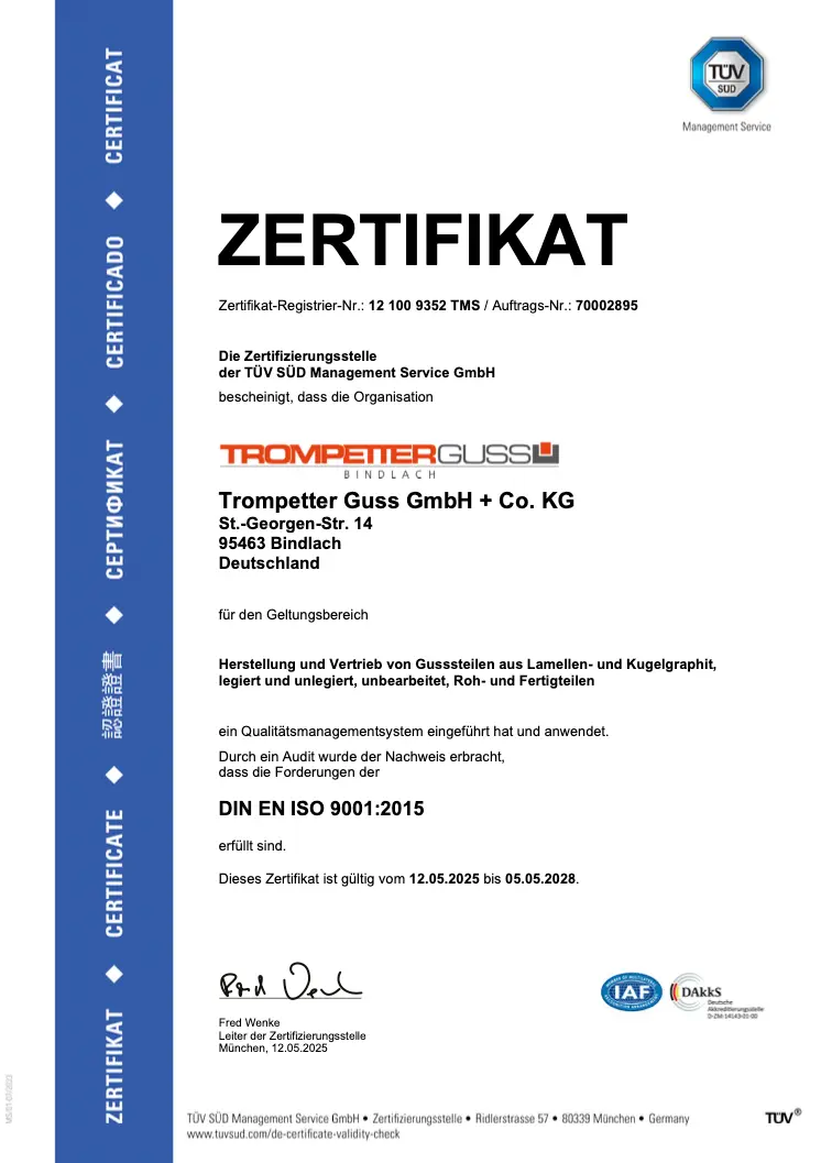 Um unseren Kunden das Höchstmaß an Gussqualität zu gewährleisten, hat TROMPETTER GUSS BINDLACH das Unternehmen an den Anforderungen des QM-Systems ausgerichtet und ist seit 1998 nach ISO 9001:2008 zertifiziert. Darüber hinaus sind wir zertifiziert nach EMAS, Lloyd´s Register of Shipping, Det Norske Veritas und AD-WO/TRD 100.